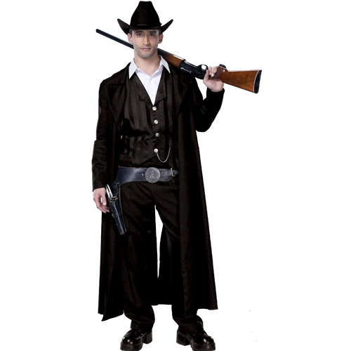 Make your living by hunting down the men on the Wanted posters and hauling them in for the bounty! This western Bounty Hunter Cowboy Adult Costume includes an adjustable fit vest with button detail, faux watch pocket with chain and a full length open duster coat with peaked waist seam. Machine washable.