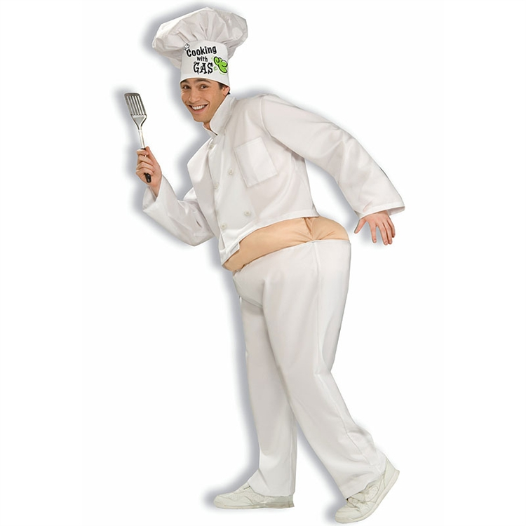 This chef has a special ingredient to make his food taste just right! This Cooking with Gas Adult Costume includes a chef hat, jacket with fart noise chip in pocket and pants with stuffed belly and buttocks. This funny adult costume comes with a battery operated fart machine! You will sure make everyone laugh… but don’t let them say no to the food you are serving.
