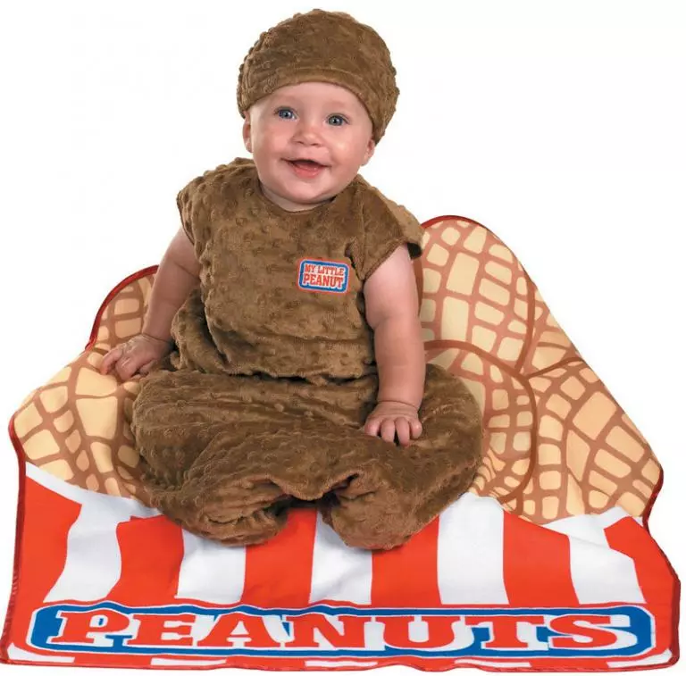 Soft brown bunting, matching cap and peanut box printed blanket.