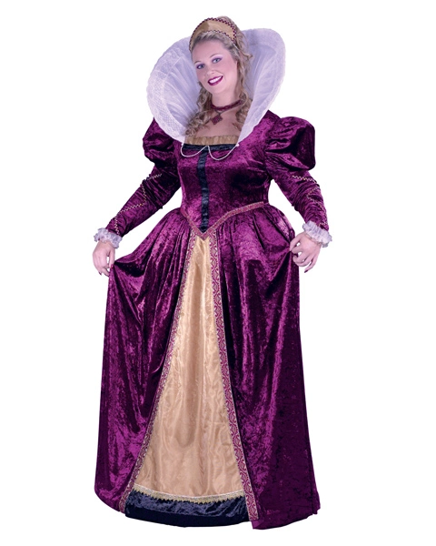 With this great costume you can relive the glory of old England and have all the men kneel in your regal presence. This Plus Size Elizabeth Queen Costume for Adults is royal statement its own with a purple gown with ornate detail, a high collar, and wire hoop, and a crown fit for a queen. Here is the perfect outfit for a Renaissance fair, theme party, or a rocking Halloween bash. This one size fits all costume will fit most women size 16 to 24. You can accessorize this Queen Elizabeth outfit with a Blonde Goddess Wig for Adults and Black Patent 5 inch Classic Pumps for Adult women. A Royal Scepter is a must-have item and a Gold Cross Necklace adds to the regal air of this one of a kind outfit. Adult Clear Brook Shoes offer the crowning touch to an outfit you will adore.