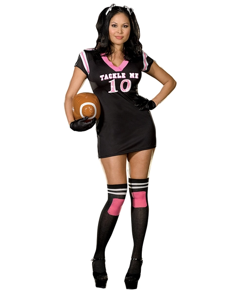 Looking for the perfect look for a sporty, sexy lady? If you want to score at your next adult event, just arrive in this Tackle Me Plus Size adult costume. This football jersey is a black, pink, and white stretch knit dress with a football mesh top section and shoulder pads, and is form fitting to show off all of your best curves. The words Tackle Me are right on front, so that nobody will have any illusions about what kind of sports you’d like to be playing this evening! We also include gloves and thigh high socks, as well as an inflatable football. Add our adult black patent Mary Jane shoes from elsewhere on this site and your sports lover might just miss the Super Bowl to come tackle you instead. Why be a football widow when you can snare him with this instead? Get yours today!