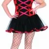 This Viking Warrior Princess brings beauty with a faux leather vest with double grommet rows and leather tie details, gauzy skirt with layered hemline and gold ribbon accent, and coordinating lace up gauntlets.