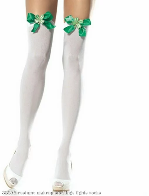 Opaque white thigh highs with shimmering green satin bows and clover applique on each top will have the gentlemen lining up to ask for the next dance!